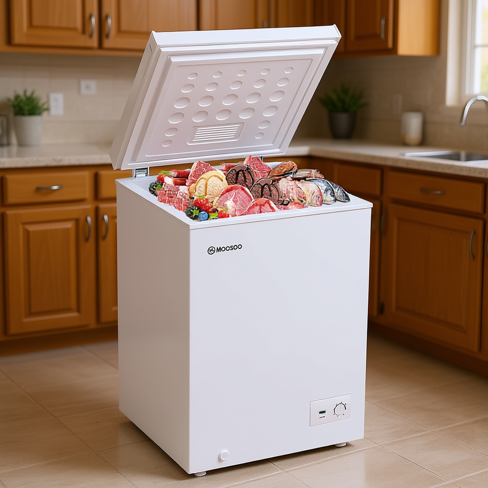 Congélateur coffre Moosoo 3,5 pieds cubes, température unique, dégivrage manuel, autoportant, blanc