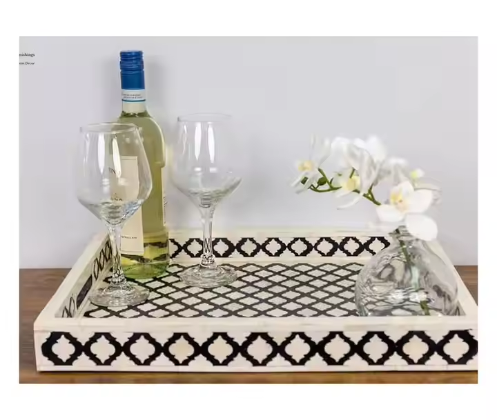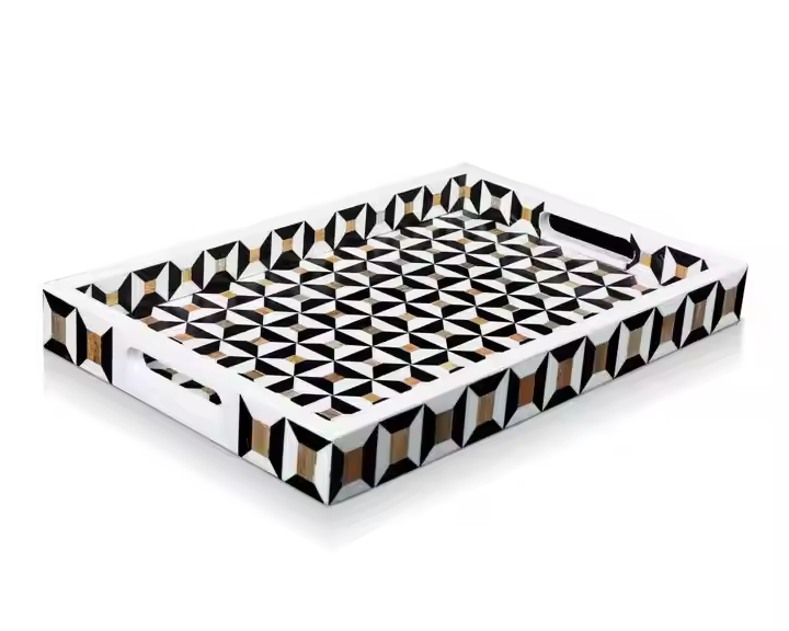Plateau à motif marocain avec incrustation de os rectangulaire bleu glacier Plateau décoratif à incrustation de os pour servir dans les hôtels et les maisons de luxe