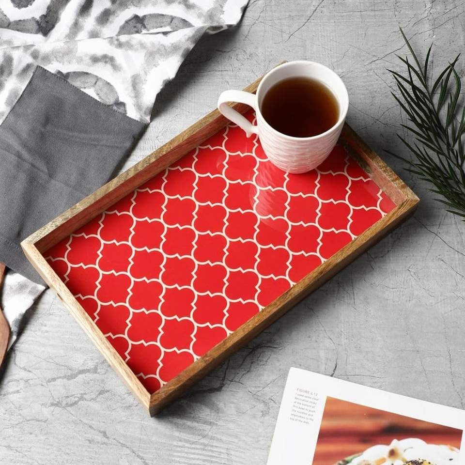 Plateau rectangulaire en bois de mangue rouge marocain, plateau de service en bois imprimé pour la décoration de la maison et l'organisation des ustensiles de cuisine et cadeau