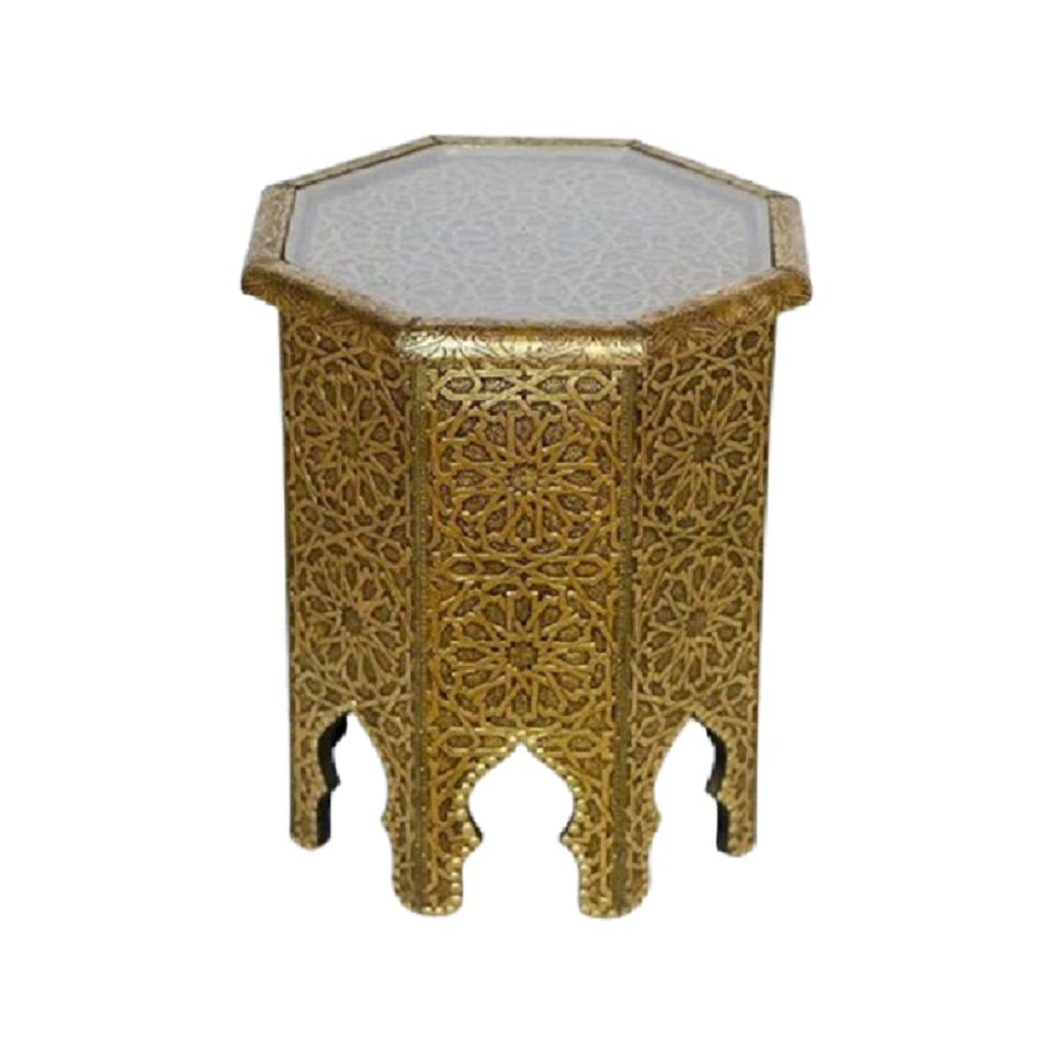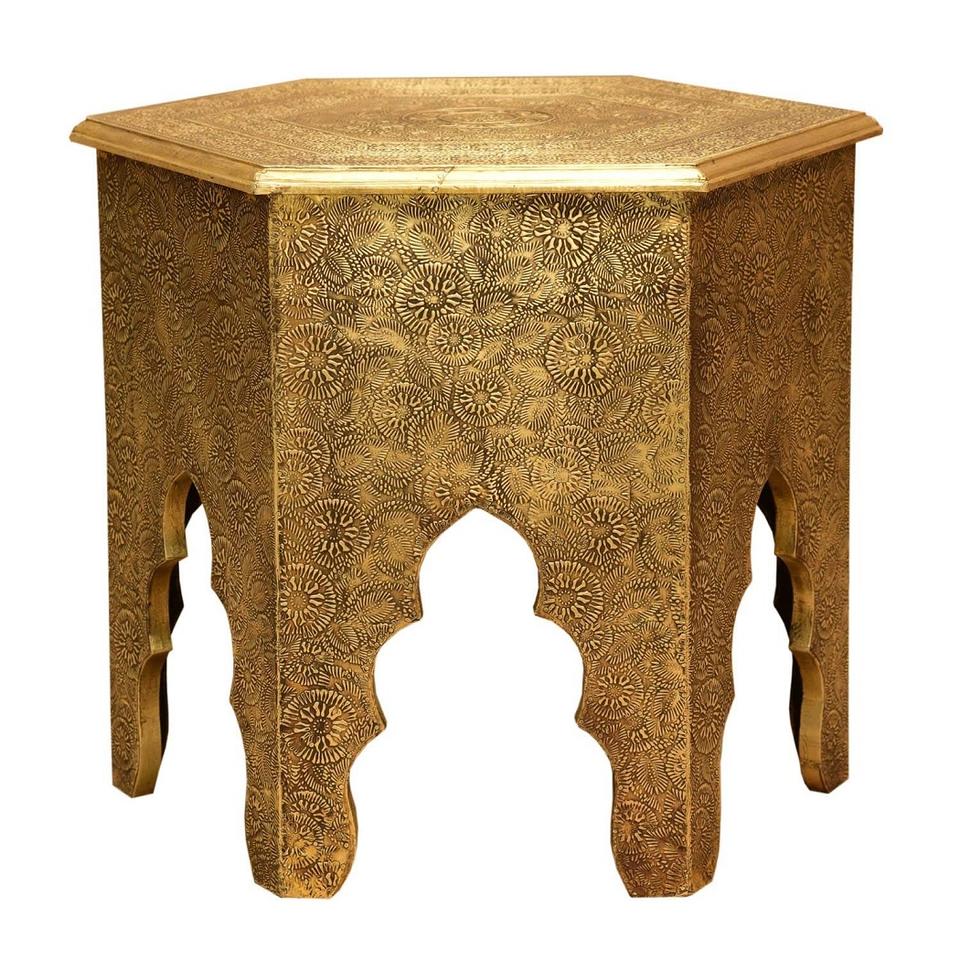Table d'appoint marocaine moderne, table basse ronde dorée vieillie avec plateau large en verre miroir pour salon, fabricant grossiste