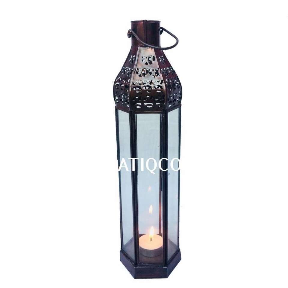 Lanterne carrée en fer à feuille rose de style marocain pour décorations de fête Lanterne en verre et en fer Céramique mate et couleur pêche