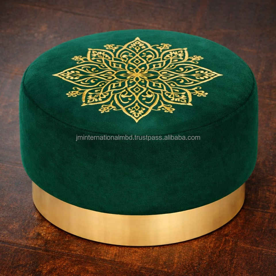 Pouf ottoman moderne en velours marocain à motifs avec base en métal doré pour hôtels et appartements