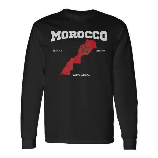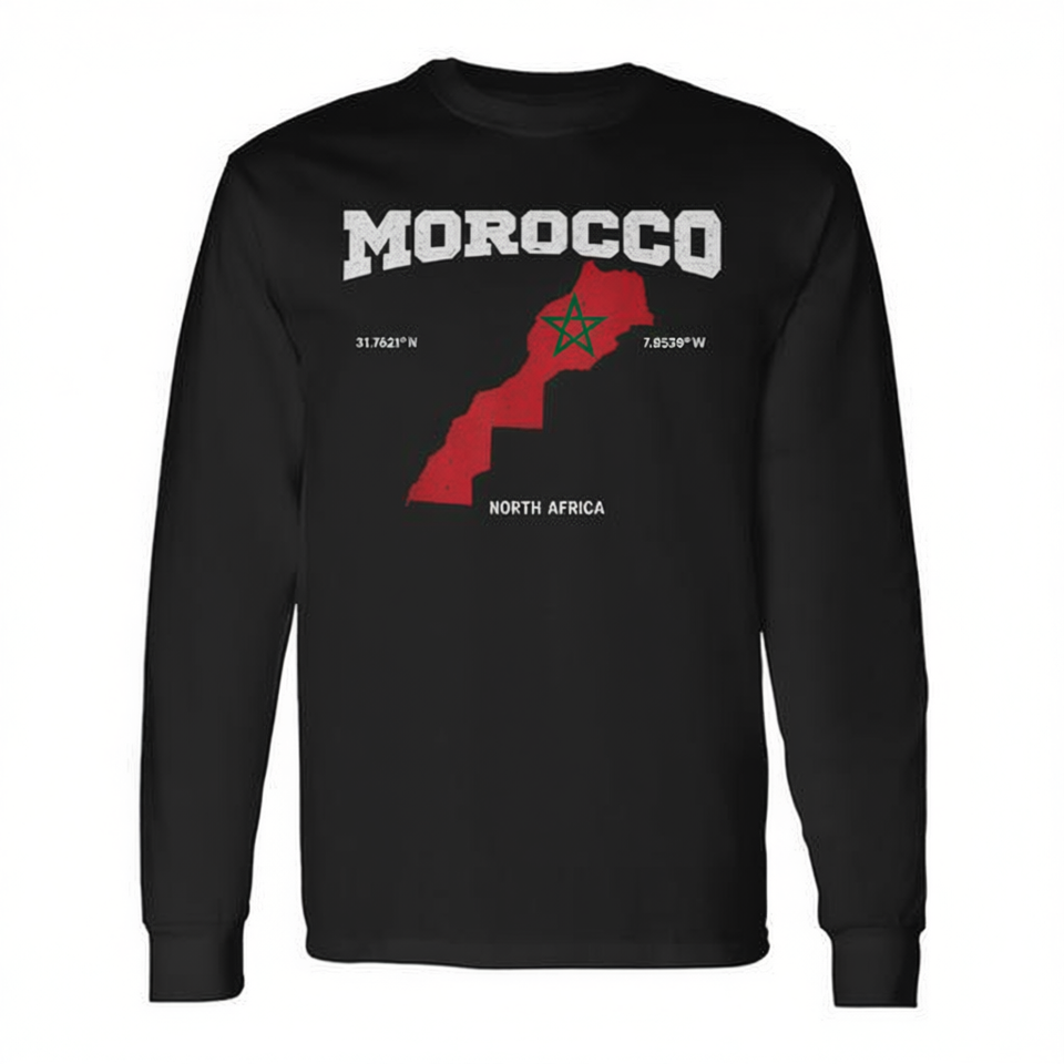 T-shirt à manches longues avec carte du drapeau du Maroc et coordonnées, design Afrique du Nord