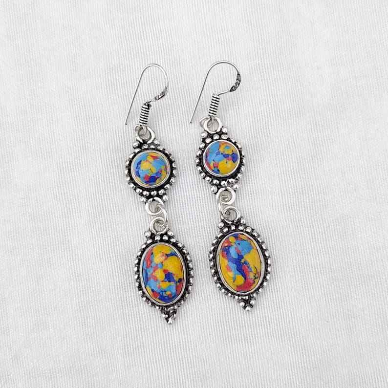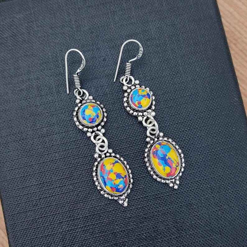 Mosaic Balloon Jasper Multi-Stone Earrings 925 Silver Plated Dangle Earrings Handmade Boho Jewelry Gemstone Drop Earrings Gift