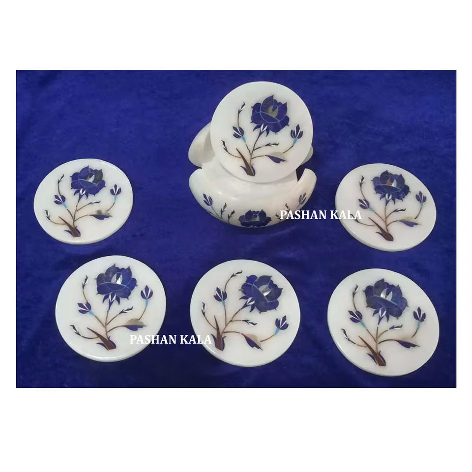 Le plus beau fait à la main forme ronde marbre blanc Lapis Lazuli incrustation travail thé caboteur ensemble pour la maison et l'hôtel décoration but