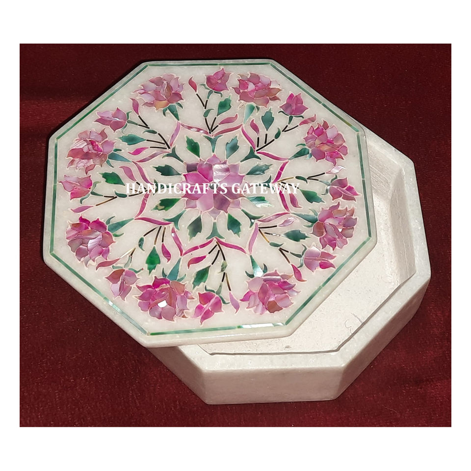 Boîte à bijoux en marbre naturel le plus beau, avec incrustations de nacre, forme octogonale, motif floral, utilisée pour les cadeaux de mariage