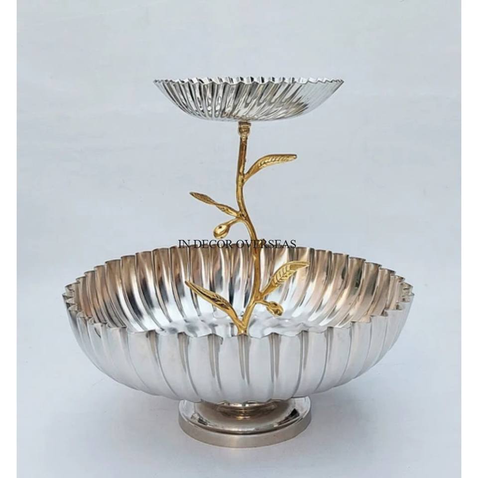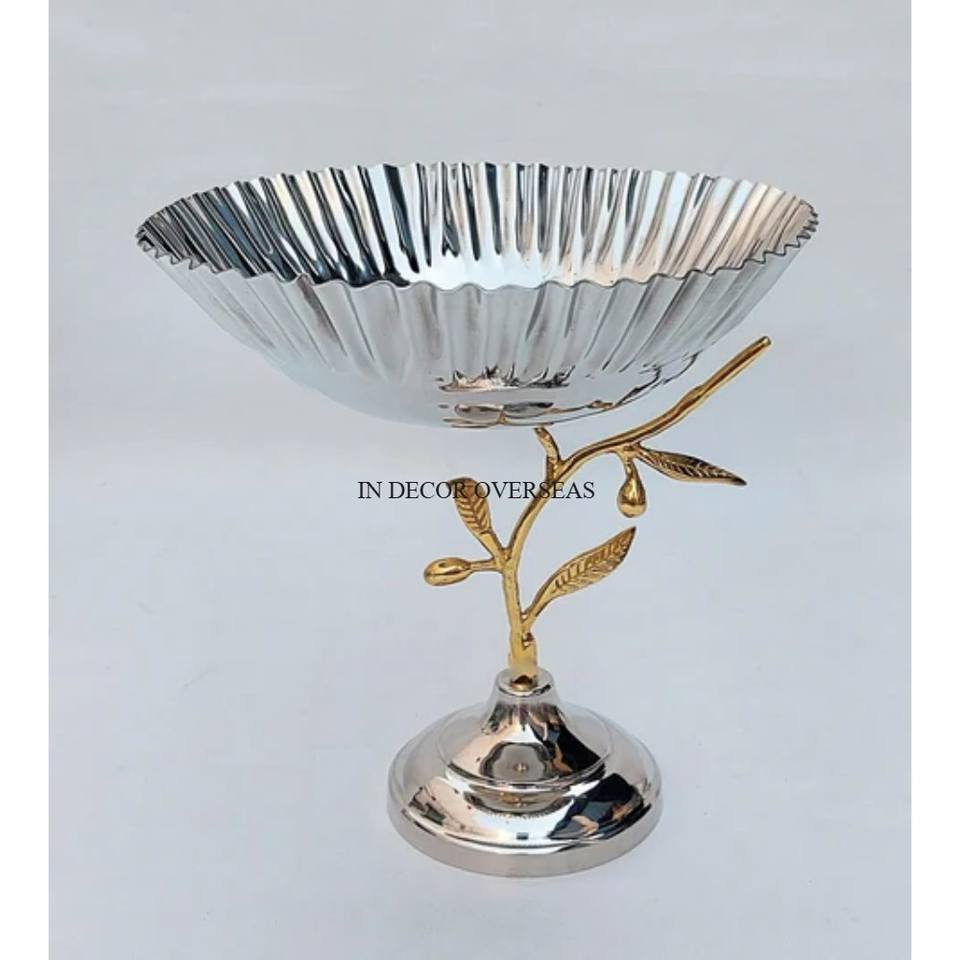 Bol de service et de décoration en métal robuste poli et argenté à texture martelée le plus demandé avec base de concepteur de feuilles plaquées or