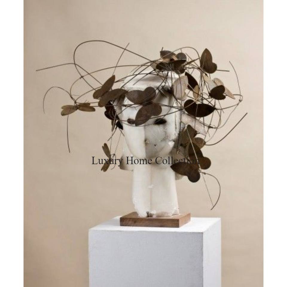 Visage humain et papillons les plus demandés Sculpture attrayante de concepteur avec base rectangulaire en bois Sculpture décorative fantaisie