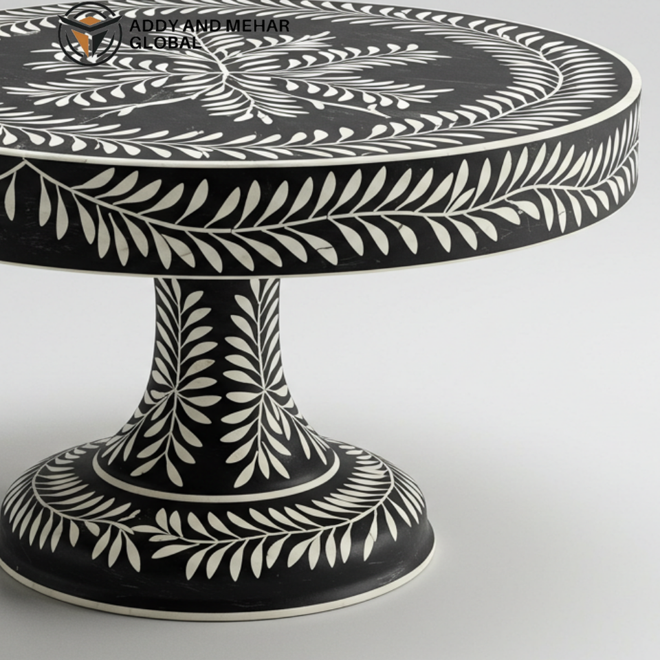 Piédestal de luxe en incrustation d'os noir le plus demandé, support pour gâteau, assiette à dessert ronde faite à la main avec motif de feuilles florales à vendre