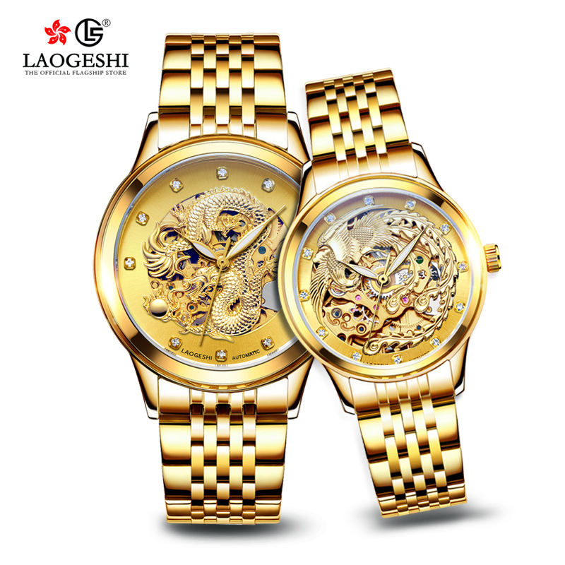 Montre automatique LAOGESHI pour couples, très populaire, haute qualité, luxe, élégante, design doré, motif de phénix sculpté, montre pour amoureux