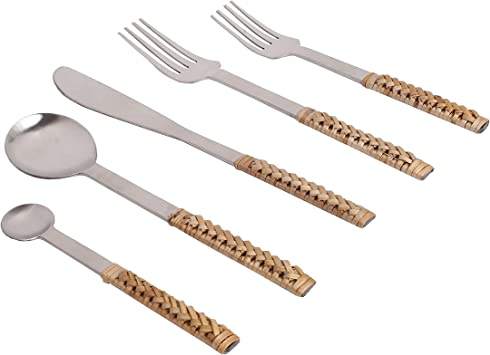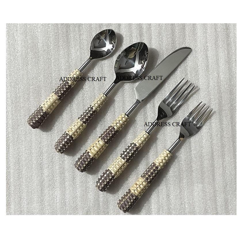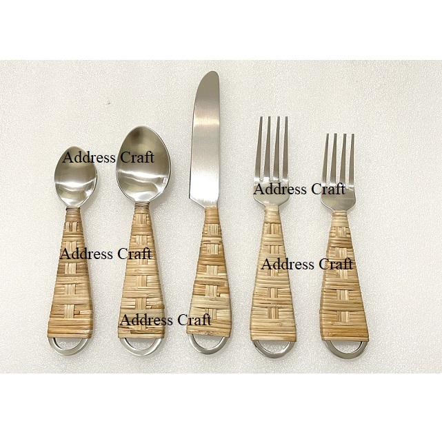 Ensemble de couverts en acier inoxydable de style américain avec manche en rotin et osier Nouvelle arrivée Ensemble de couverts Vaisselle Cuillère à dessert Fourchette Couteau