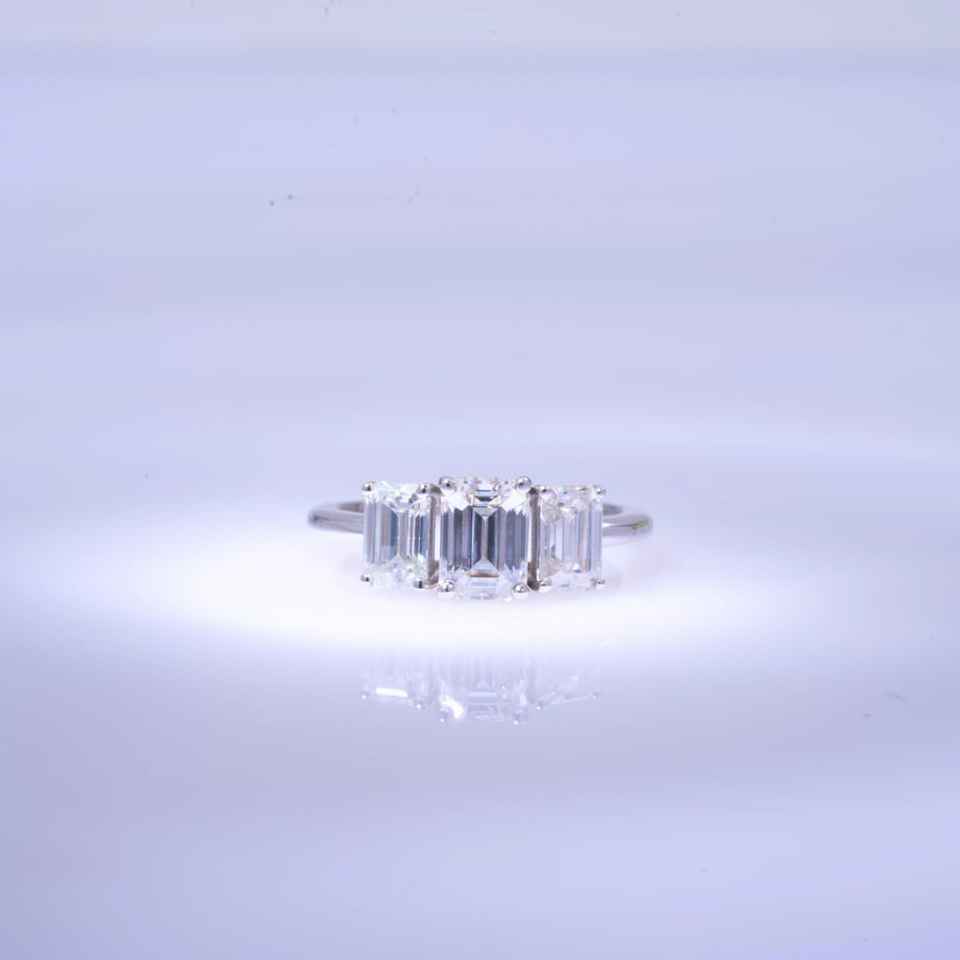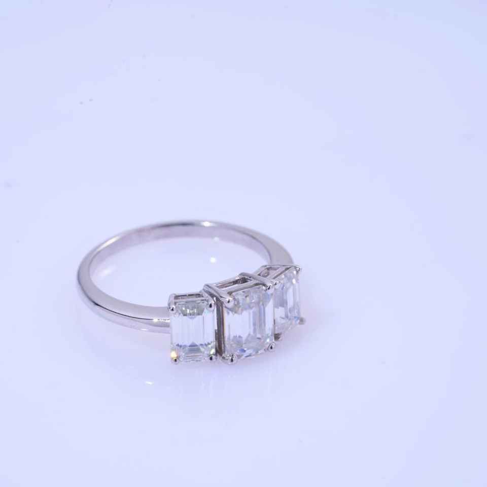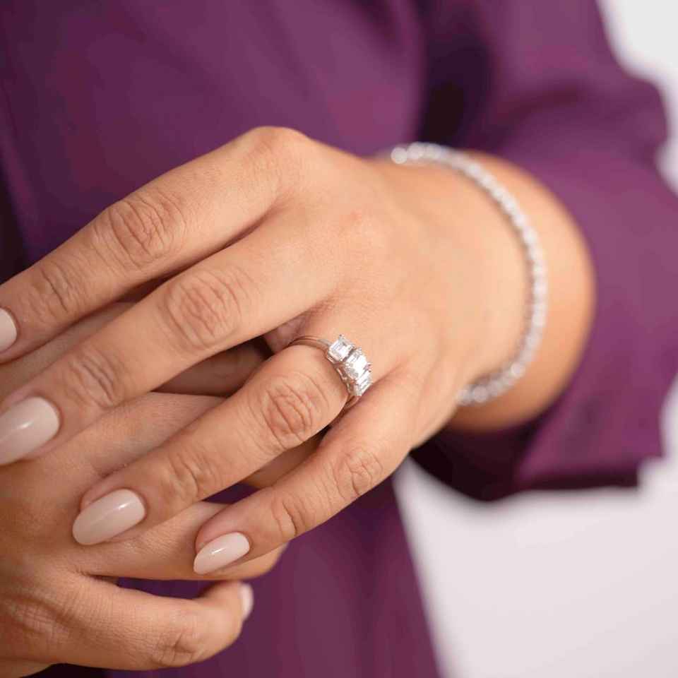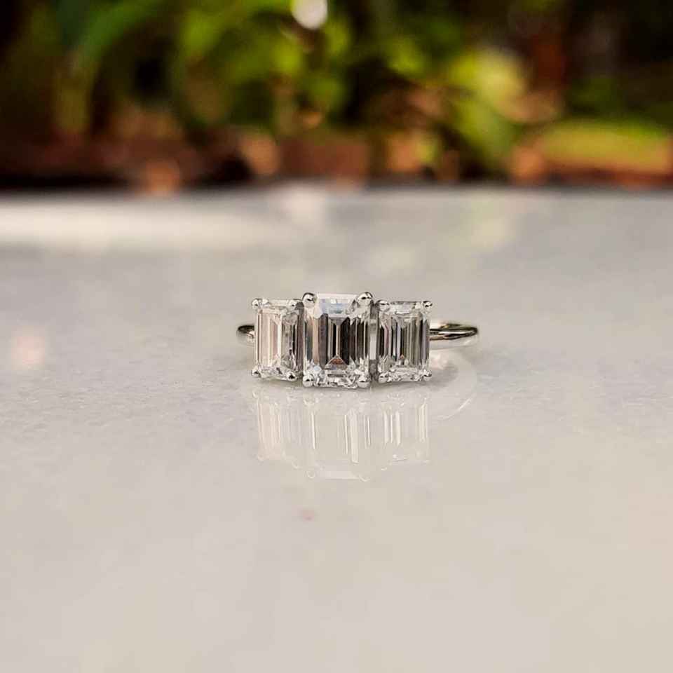 Bague en diamant Moissanite à trois pierres de taille émeraude la plus vendue élégance intemporelle avec étincelle brillante disponible au meilleur prix
