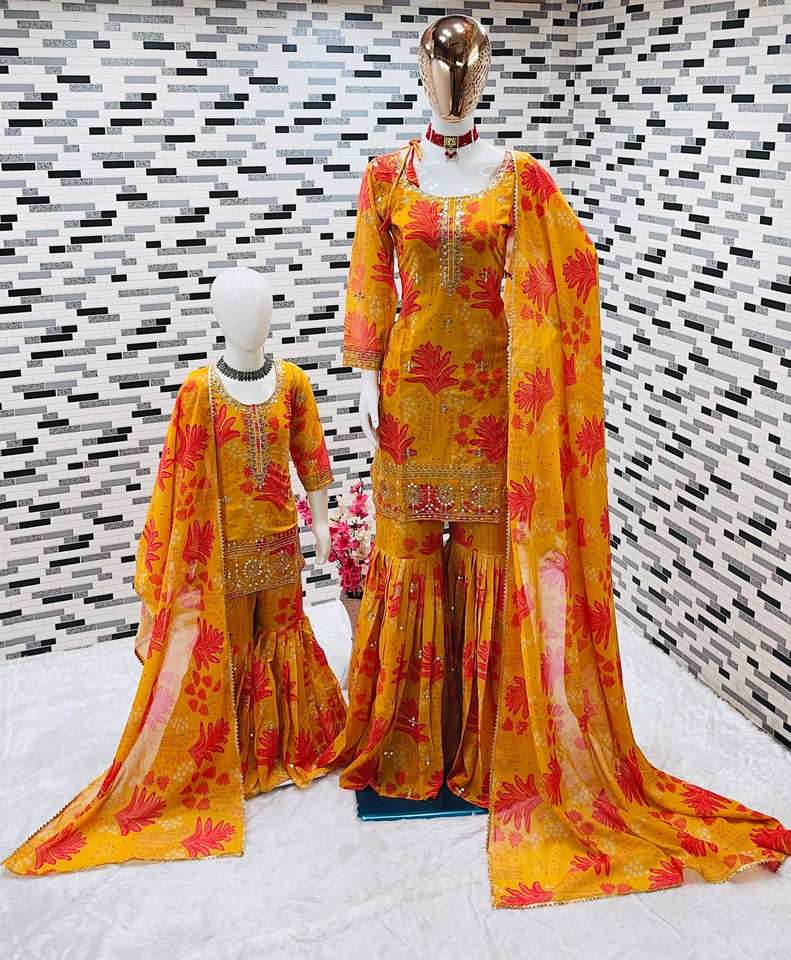 Ensemble Sharara en Georgette à imprimé numérique assorti mère-fille avec dupatta – Collection de vêtements de fête