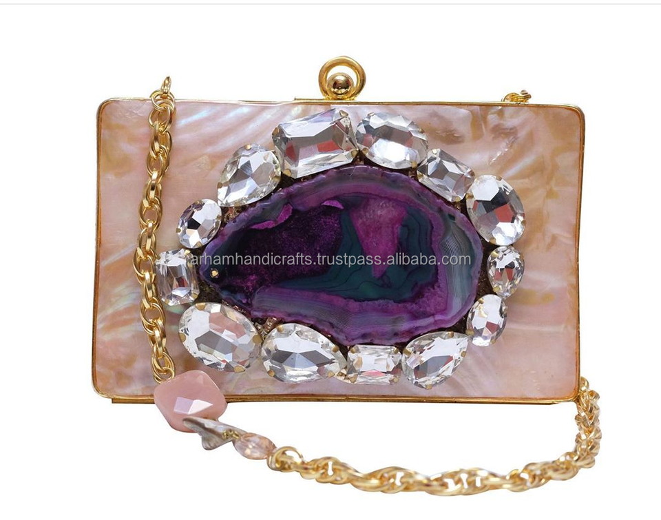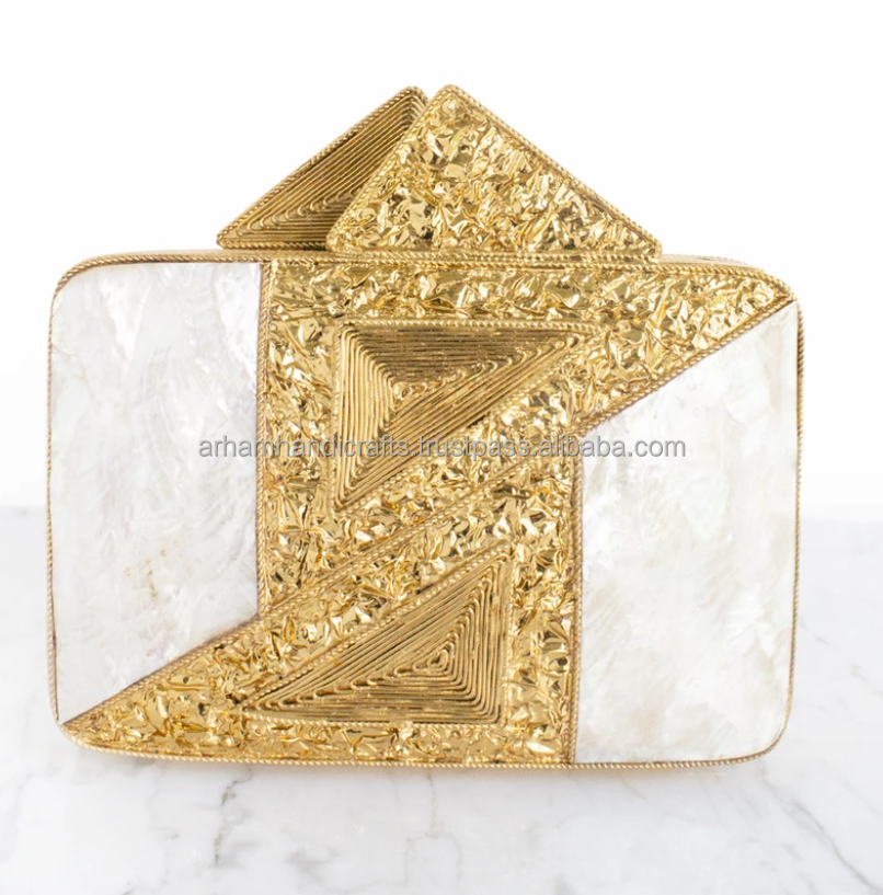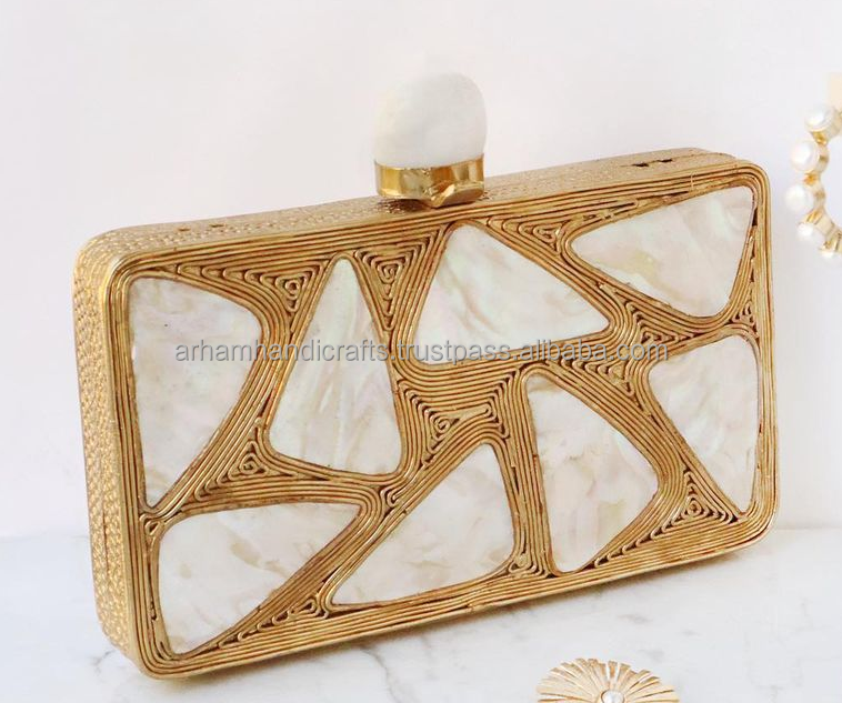 Luxury Crafts Wholesale Girls' Mother of Pearl Flower Work Clutch with Brass Handcrafted Stone Pattern for Wedding Parties