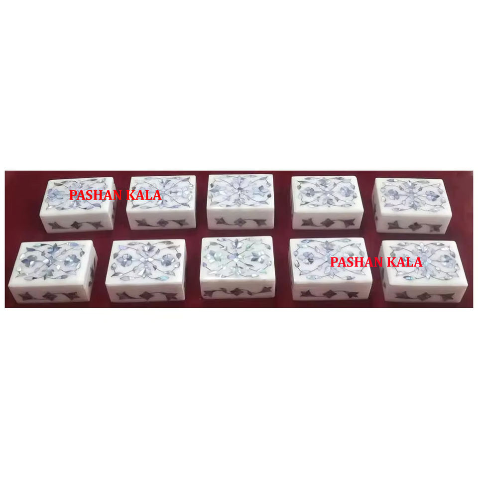 Incrustation de marbre blanc faite à la main de forme rectangulaire avec boîte à bijoux en nacre bleue de qualité supérieure pour la maison