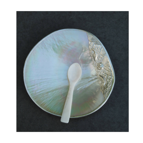 Mother of Pearl Dish crafted with glossy shell overlay and wooden tray base for organizing trinkets made in Vietnam
