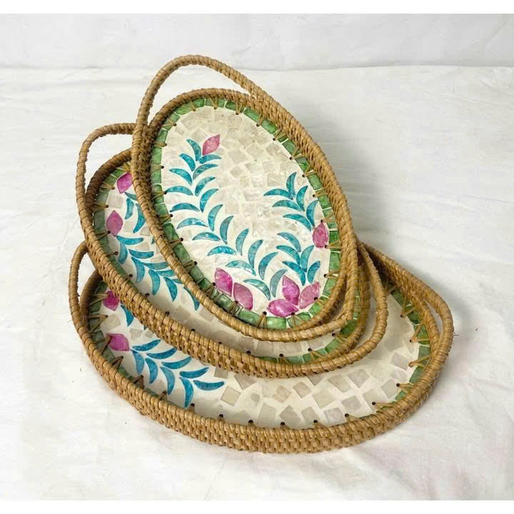 Plateau en rotin incrusté de nacre, plateau de service tissé à la main pour le thé, décoration de la maison