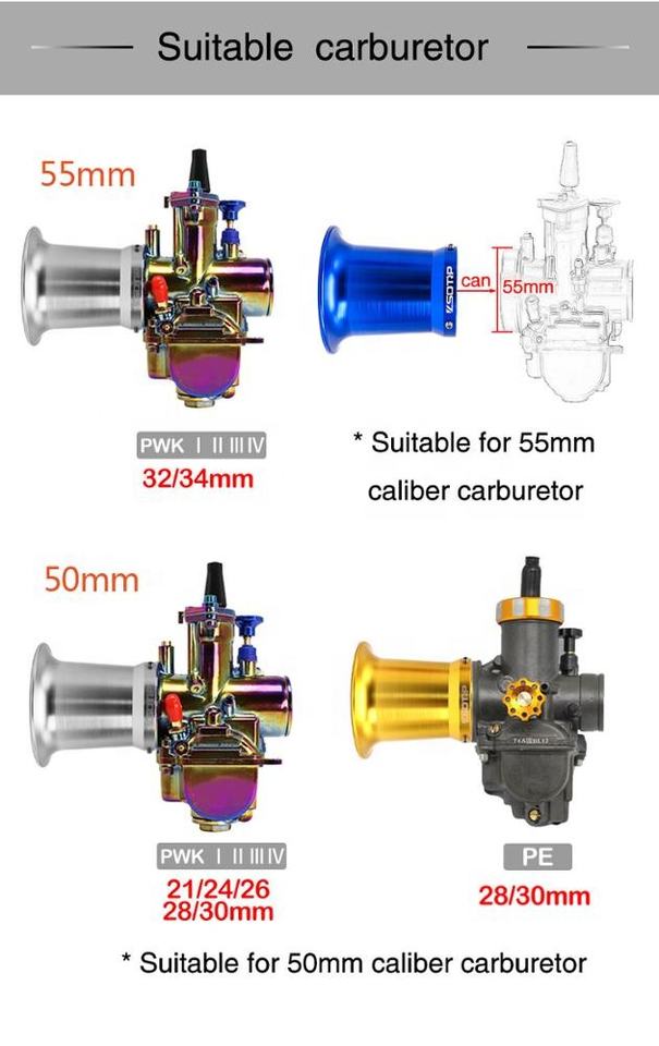 Moto Aluminium 50/55mm Velocity Stack Racing Carburateur Filtre À Air Entonnoir Coupe Vent Corne Coupe pour P.w.k. O. K. O.