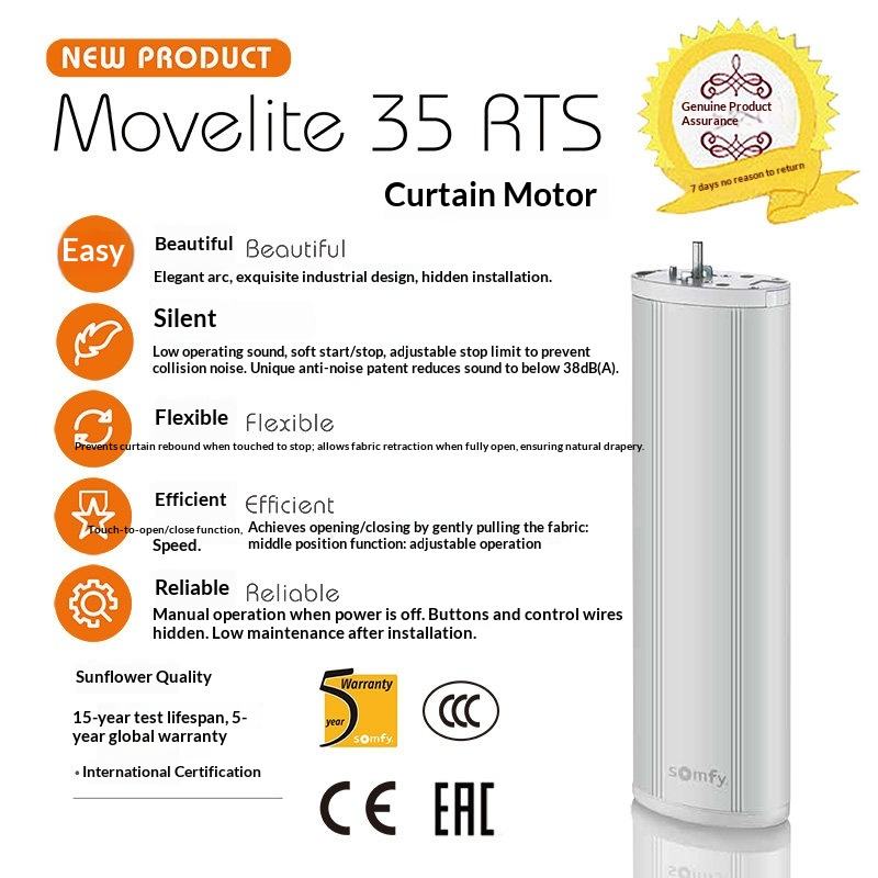 Moteur de rail de rideau motorisé Movelite35RTS - Contrôle sans fil RTS Garantie de sécurité Compatible avec la maison intelligente