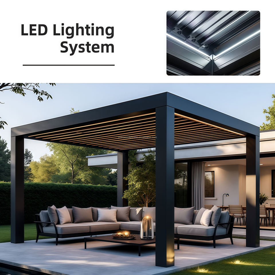 Pergola bioclimatique motorisée en aluminium à lames orientables, résistante aux intempéries, pour jardin et terrasse, avec revêtement poudré