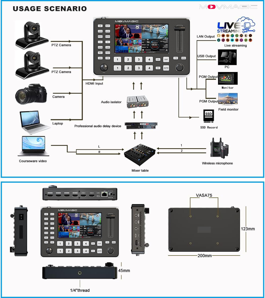 Movmagic M1 Commutateur vidéo professionnel, processeur de signal multi-formats avec 4 entrées et 2 sorties PGM pour la diffusion en direct