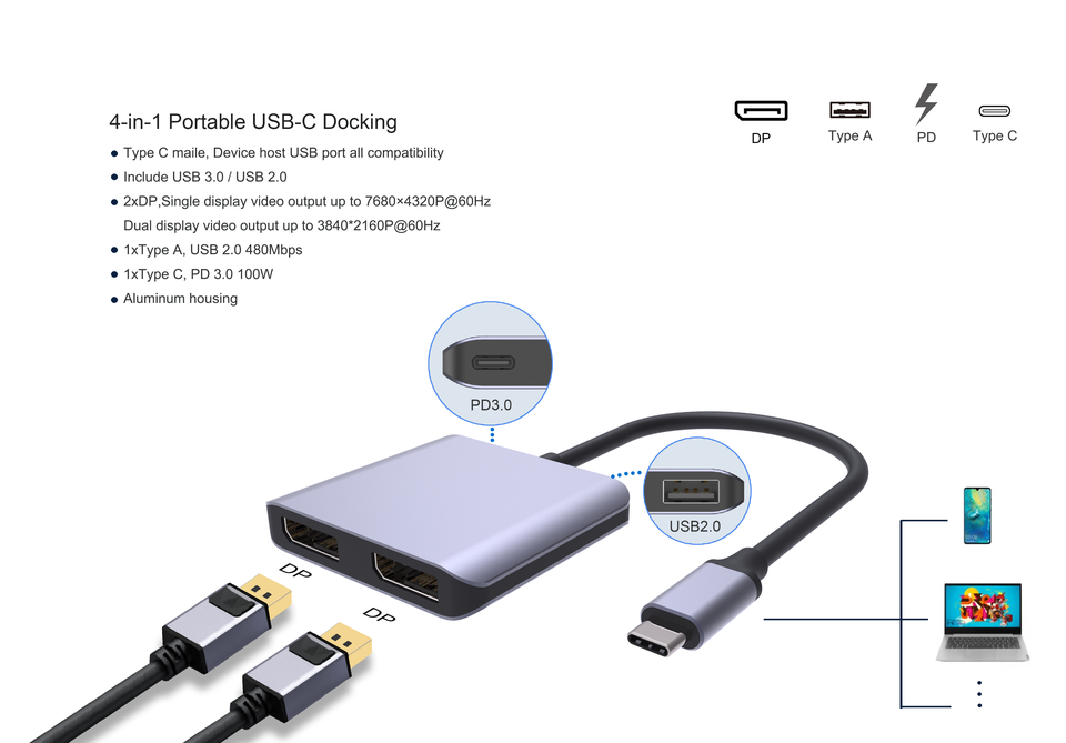 Output:2X8K30Hz DP + USB 2.0 + PD 100W