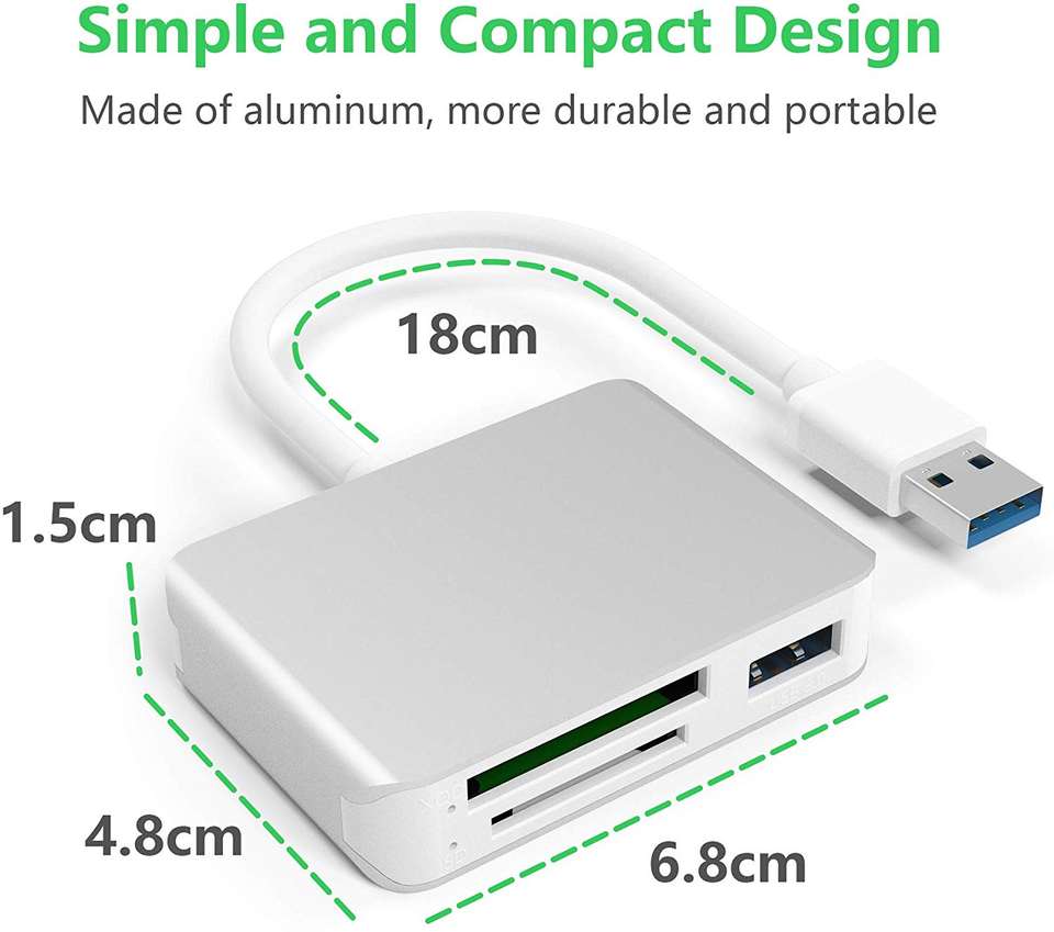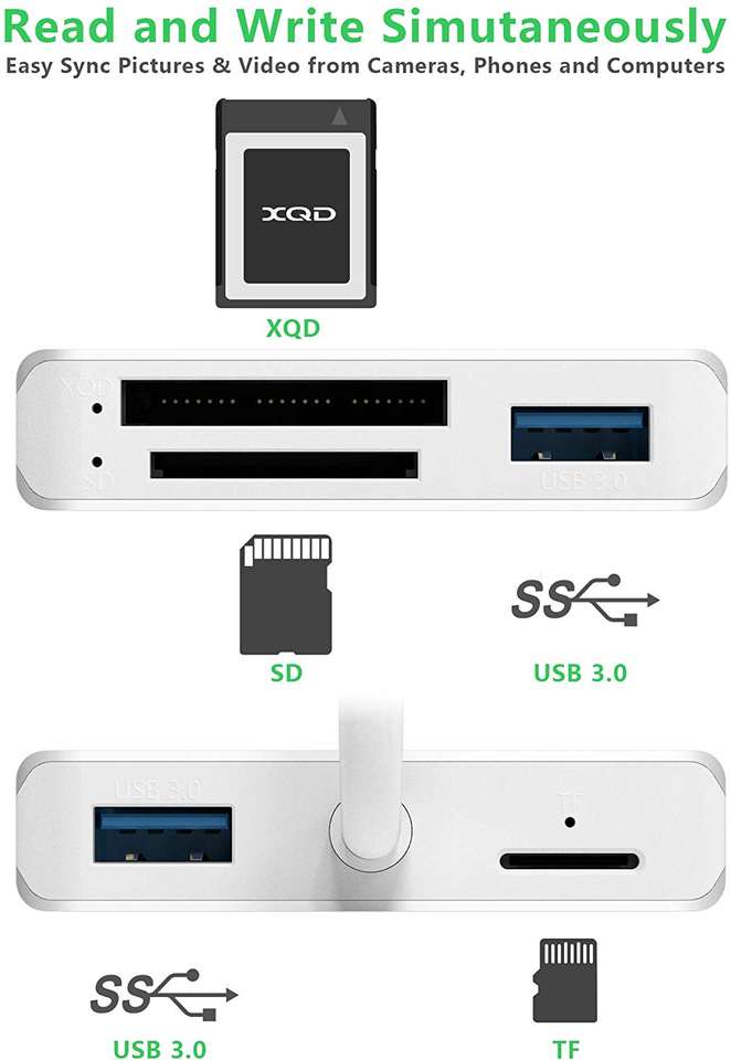 Fonctionnalité clé 1:Lecteur de cartes et hub combinés 5 en 1 en aluminium, 2 ports USB 3.0, carte XQD