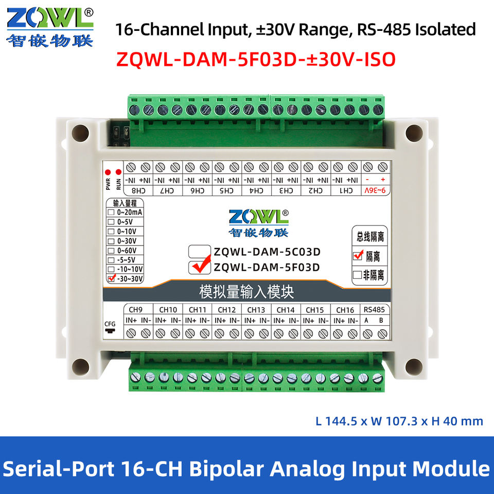 Module d'entrée analogique multicanal | 16 bits, précision de 0,1 %, Modbus RTU | Gamme ±30V, RS-485 isolé