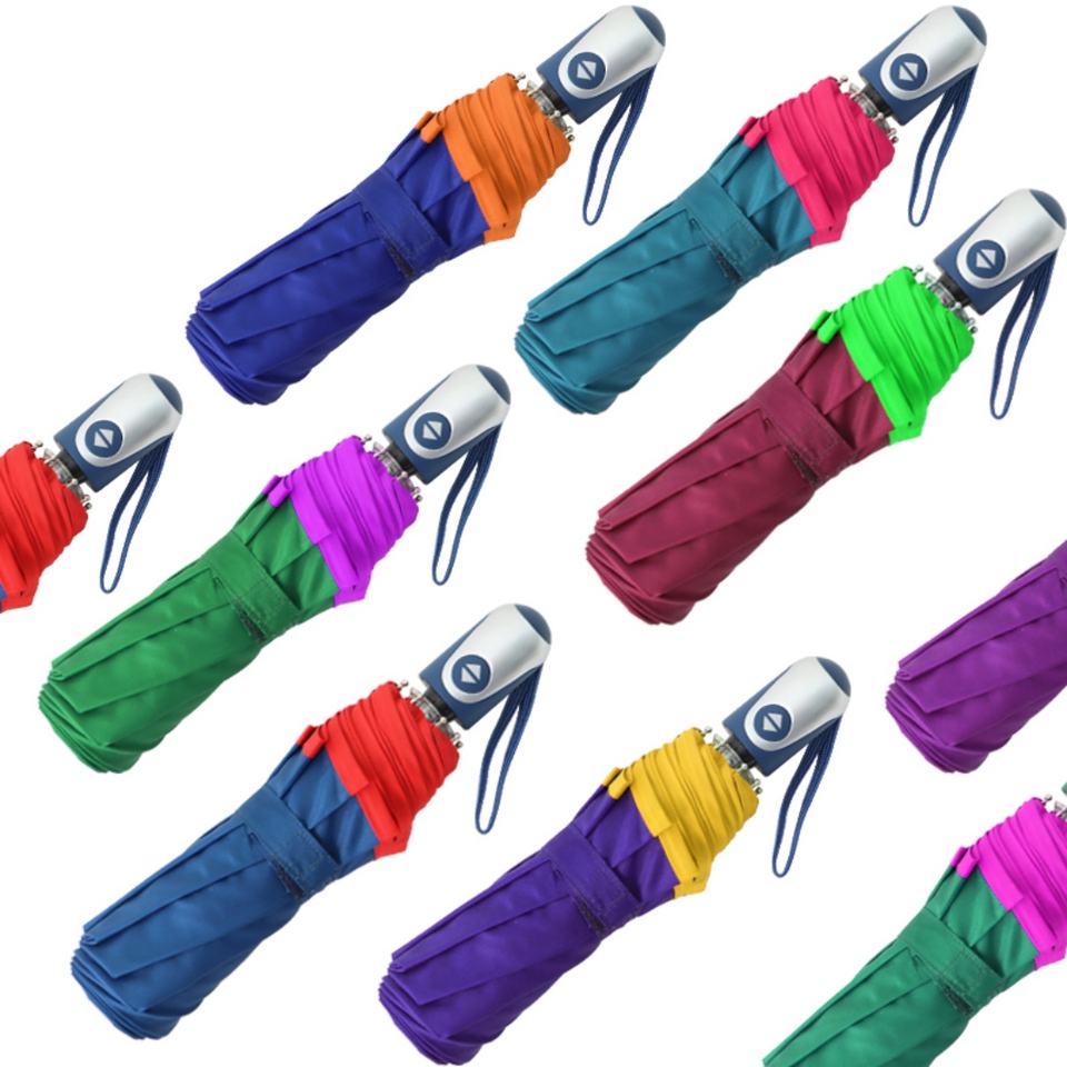 Parapluie pliable automatique de grande taille multicolore, forme ronde, bleu avec bande rouge pour les voyages