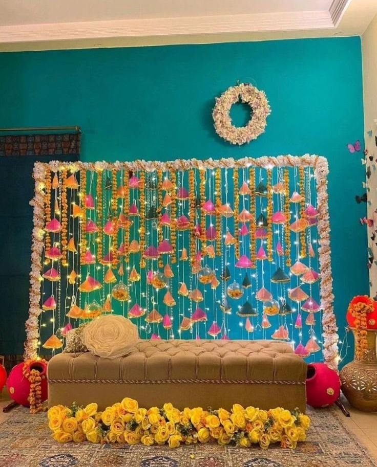 Mots clés:Décoration intérieure Diwali : guirlande de pompons colorés, idée de décoration pour temple.