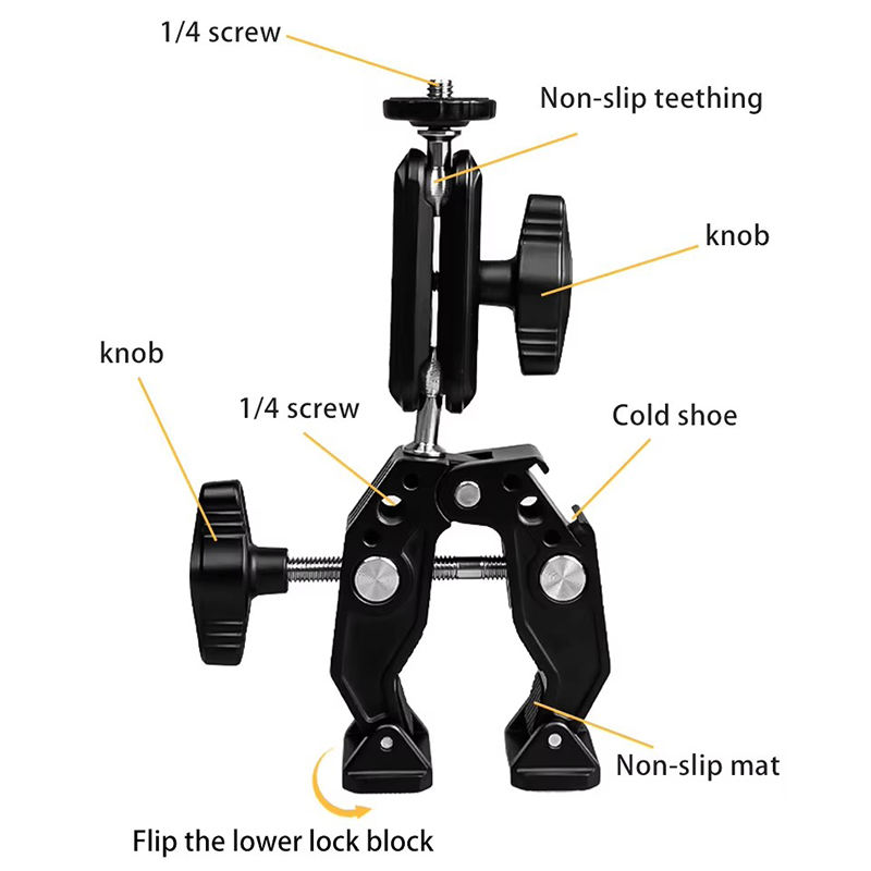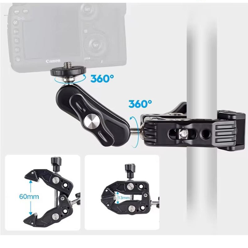 Pince de photographie multifonctionnelle en alliage d'aluminium de 1/4 pouces avec bras magique, trou de vis pour montage vidéo intérieur et extérieur