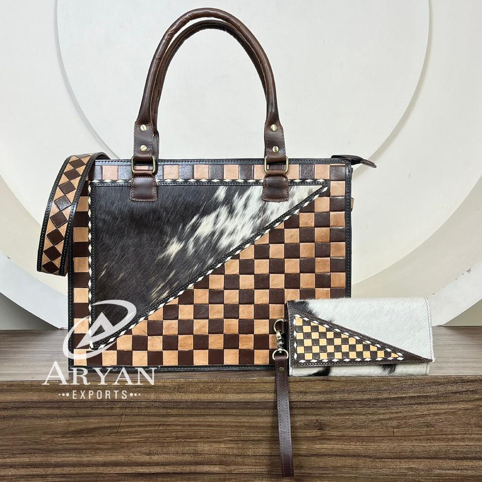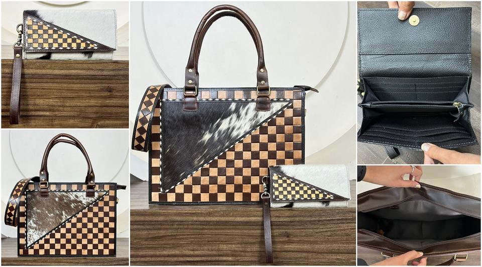 Sac à main en cuir à carreaux multifonctionnel et durable avec portefeuille assorti en cuir de vachette, ensemble combiné en cuir véritable fait main pour femmes