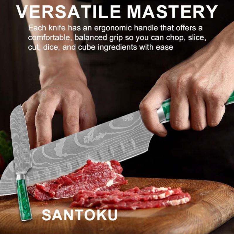 Ensemble de couteaux de cuisine japonais multifonctionnels en acier au carbone à motif laser Damas, couteaux de chef et hachoirs pour trancher les aliments