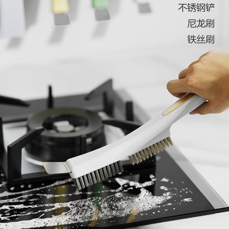 Brosse de nettoyage multifonctionnelle pour cuisinière, poils en nylon pour les fentes, brosse pour cuisinière à gaz avec spatule en acier inoxydable