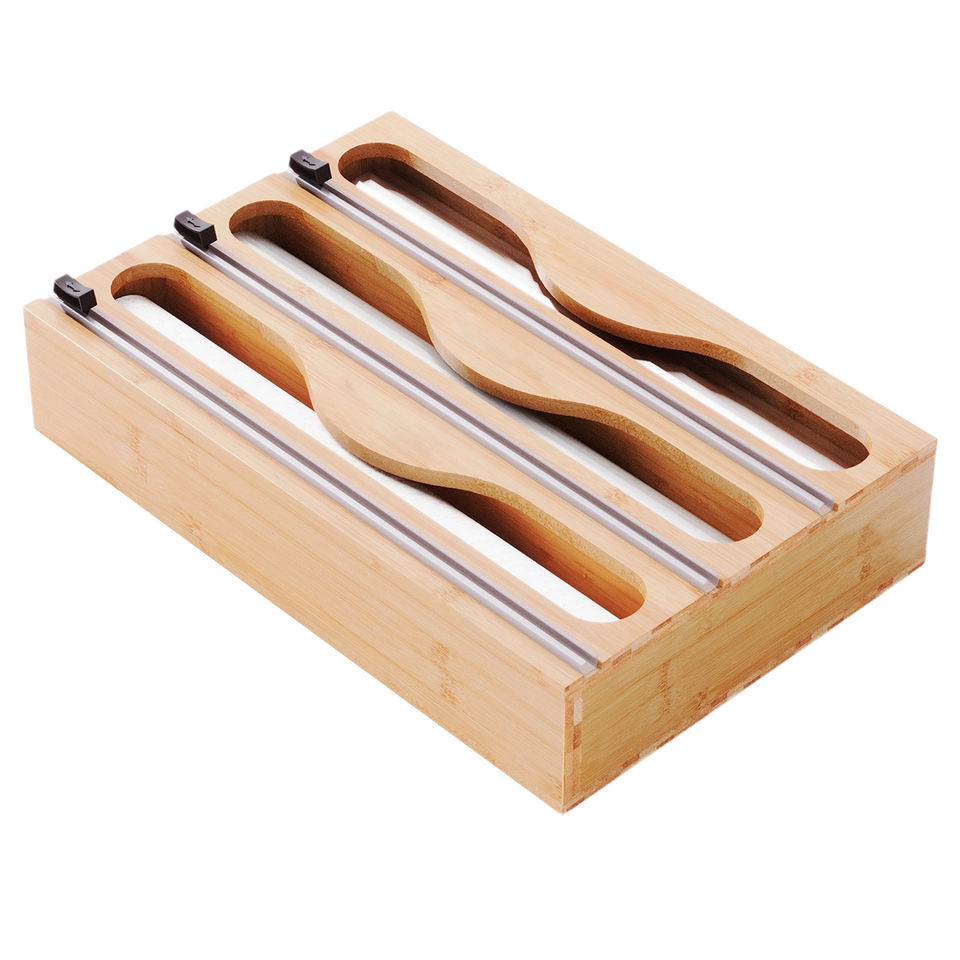 Distributeur mural multi-niveaux pour film alimentaire, boîte de rangement en bambou pour papier d'aluminium avec coupe bidirectionnel pour ustensiles de cuisine