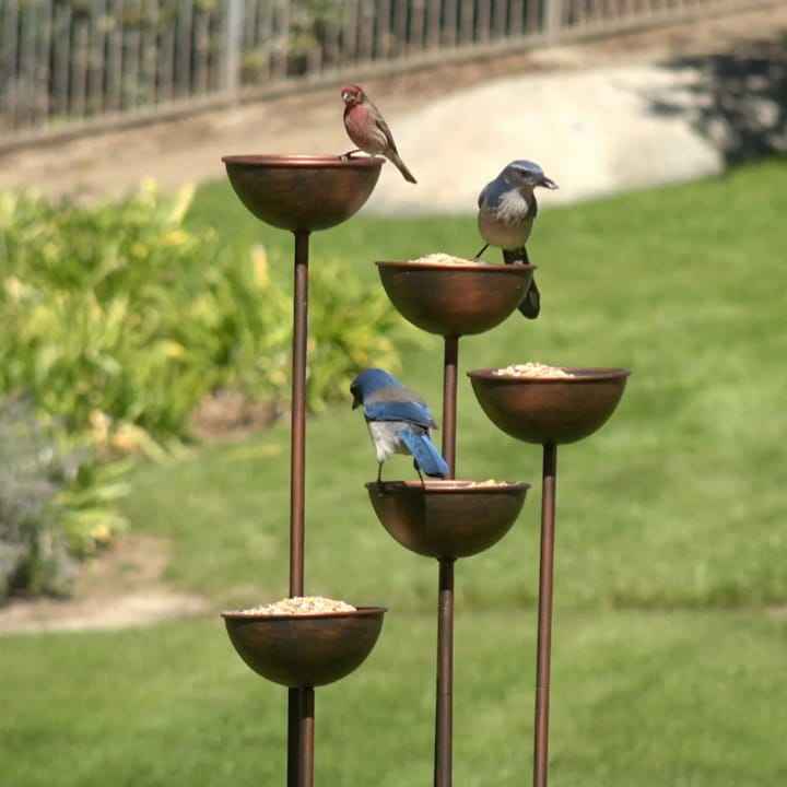 Mangeoire à oiseaux multi-niveaux en cuivre sur piquet, avec 5 bols en métal pour graines, pour oiseaux sauvages, jardin, cour, extérieur, aménagement paysager