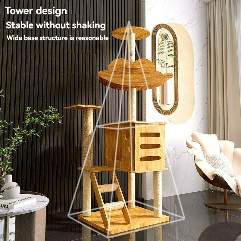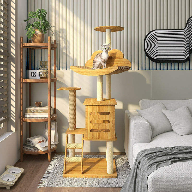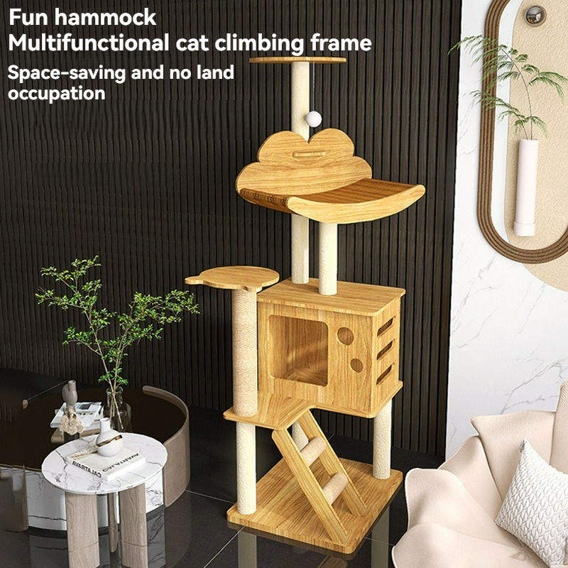 Arbre à chat multi-niveaux en bois avec lit en rotin rotatif, grande maison pour chat, échelle, jouet interactif avec balle pour chats d'intérieur