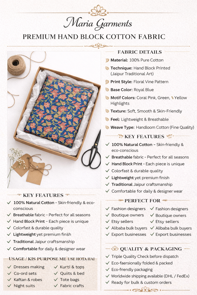 Tissu en coton imprimé à la main de Jaipur, multi-usages, motif floral, textile indien fait main, pour toute production de vêtements sur mesure