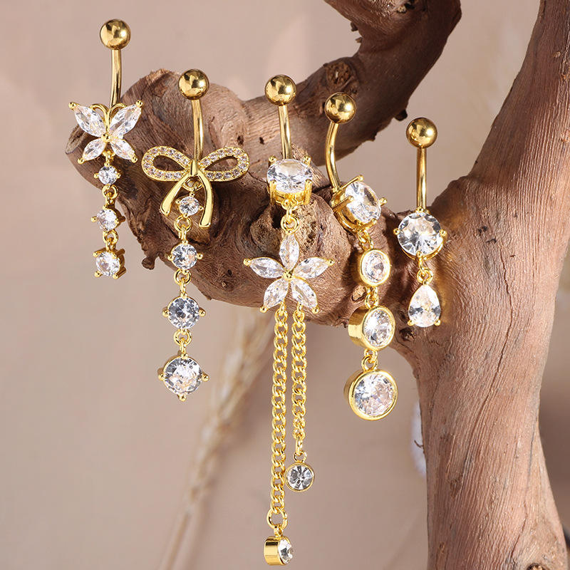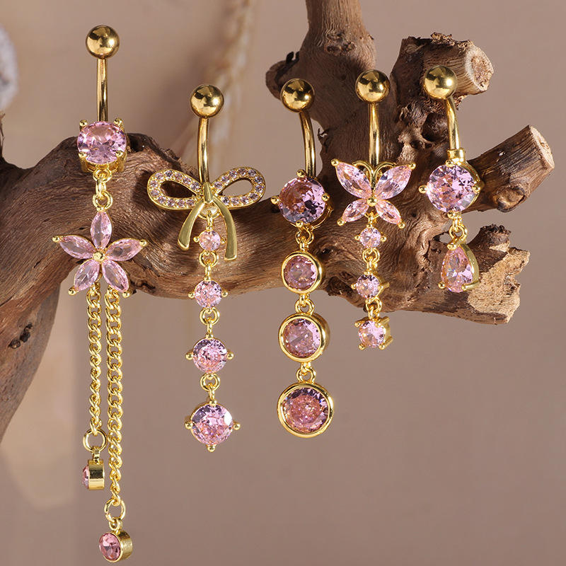 Piercing de nombril long multi-styles en acier inoxydable plaqué or avec micro-incrustation de zircon rose et pendentif papillon