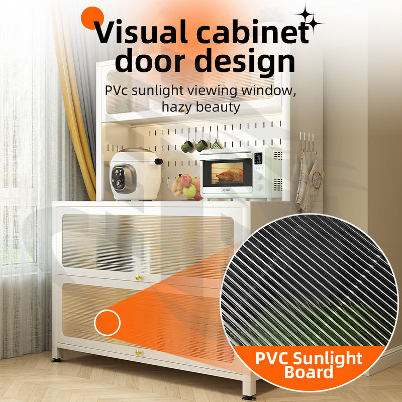 Meuble de rangement de cuisine multifonctionnel avec portes en verre cannelé et panneau perforé, grande capacité, organisateur roulant, buffet en acier