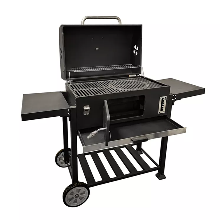 Barbecue multifonctionnel en acier avec revêtement en poudre, fumoir au charbon de bois, extérieur, jardin, robuste, sans fumée, avec roues