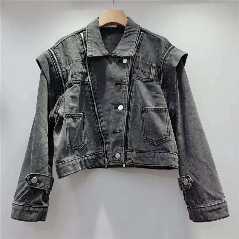 Multi-zipper Denim Jacket Women Blue Gray Short Coat Turndown Collar Single-breasted Spring Casual Jacket