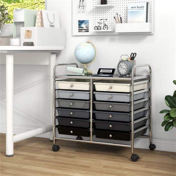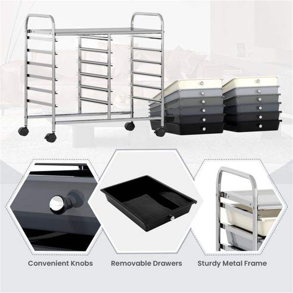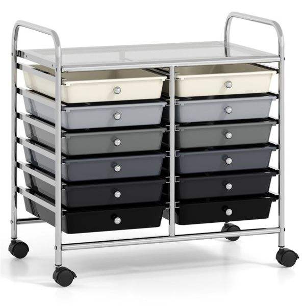 Chariot de rangement roulant multicolore à 12 tiroirs, 2 rangées, 10 niveaux, avec 4 roues (2 freins), gris – Solution de rangement multicolore durable