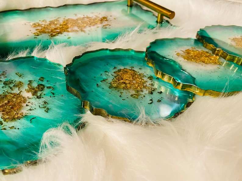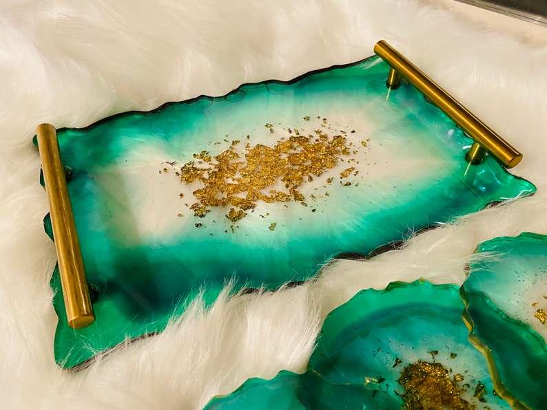 Plateau de service à café fantaisie Art Déco en résine multicolore avec poignées en aluminium plaqué or, motif Onyx, plateau à bijoux Ramadan