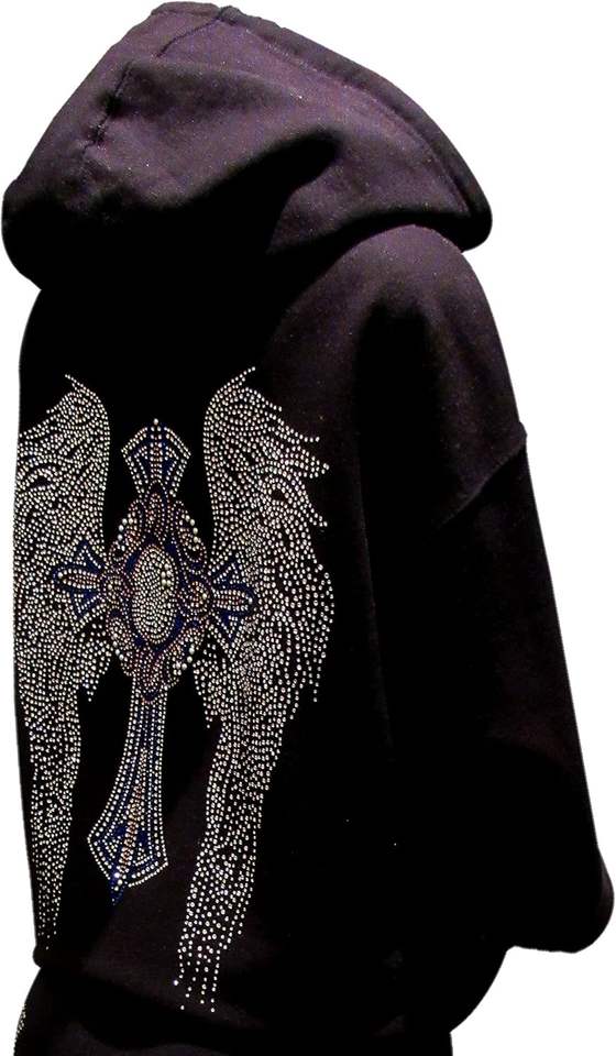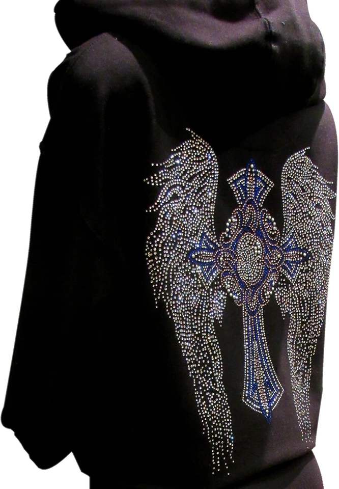 Opulent Multicolore Strass Croix Ailes d'Ange Unisexe Adulte Noir Zipper Hoodie à capuche dispose d'un design luxueux col zippé