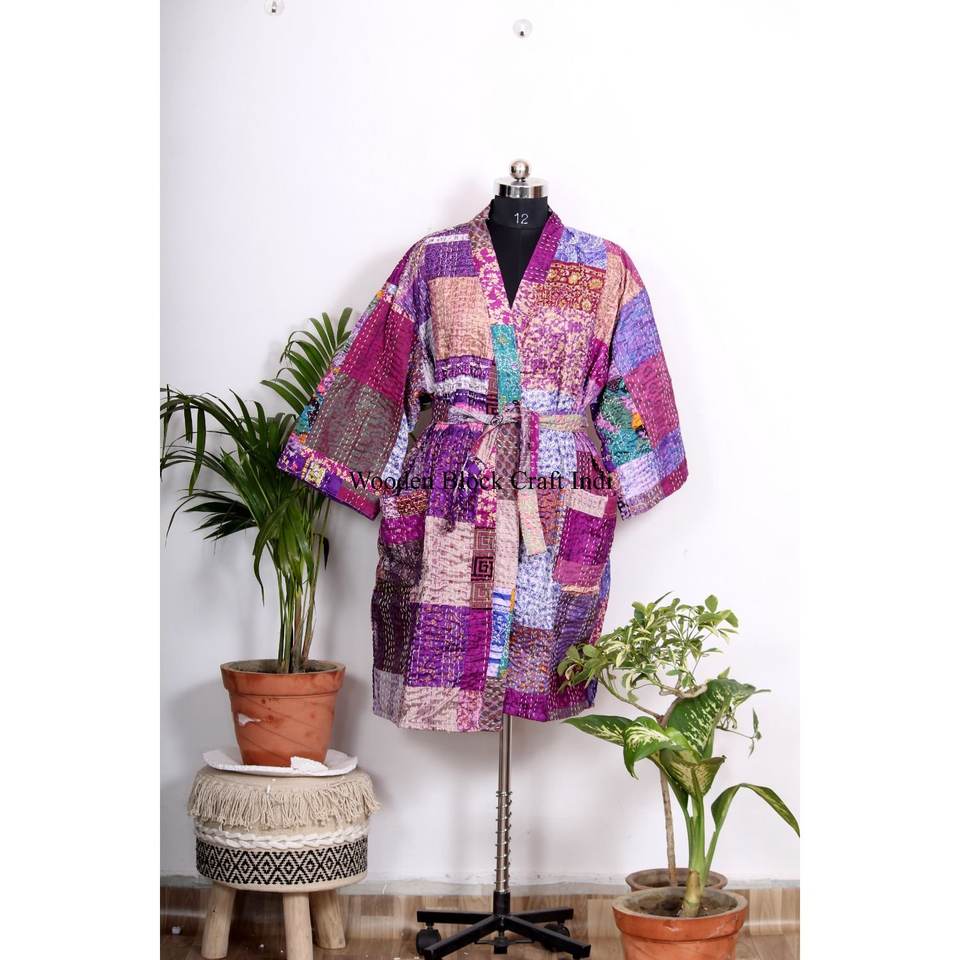 Kimono Kantha multicolore en patchwork de soie fait main, robe Kantha unique pour l'hiver, robe kimono indienne en patchwork au prix d'usine