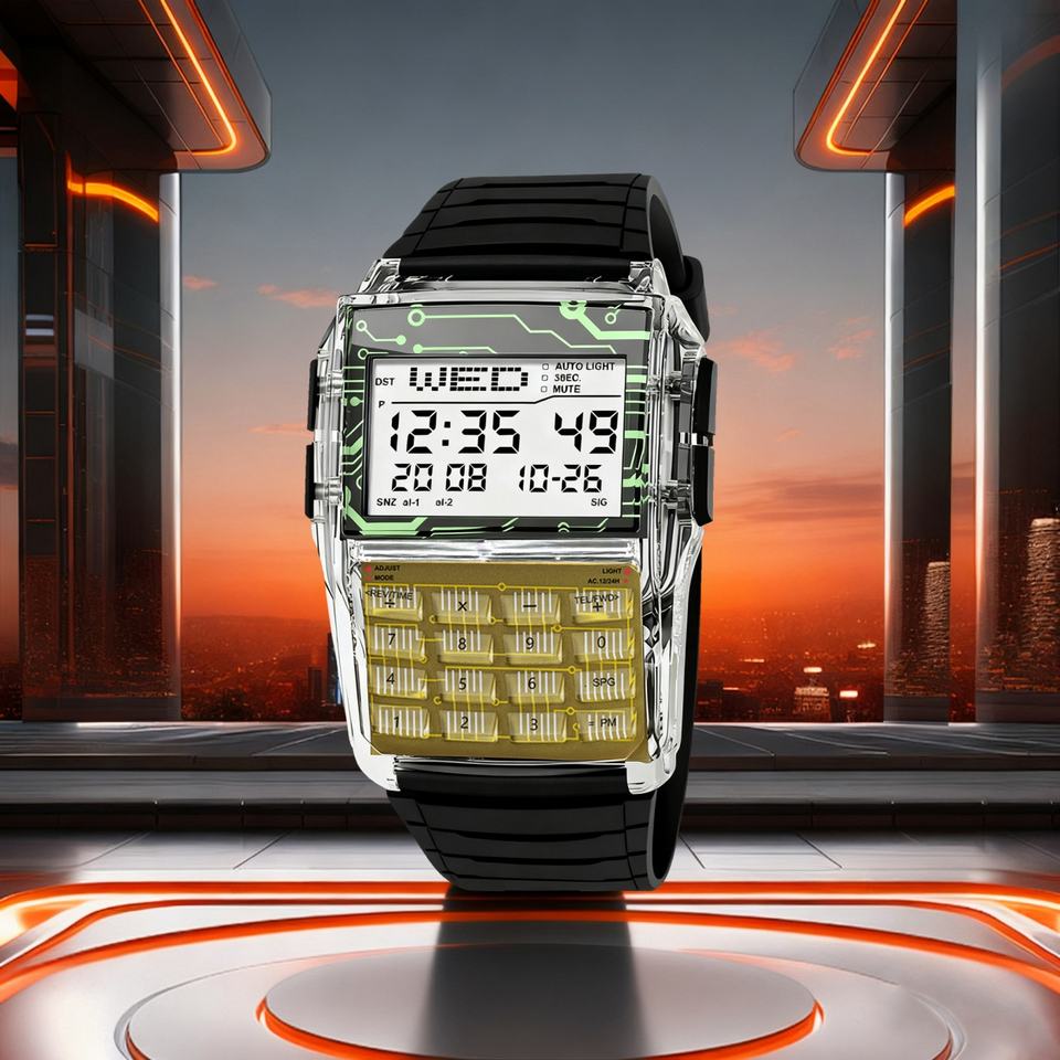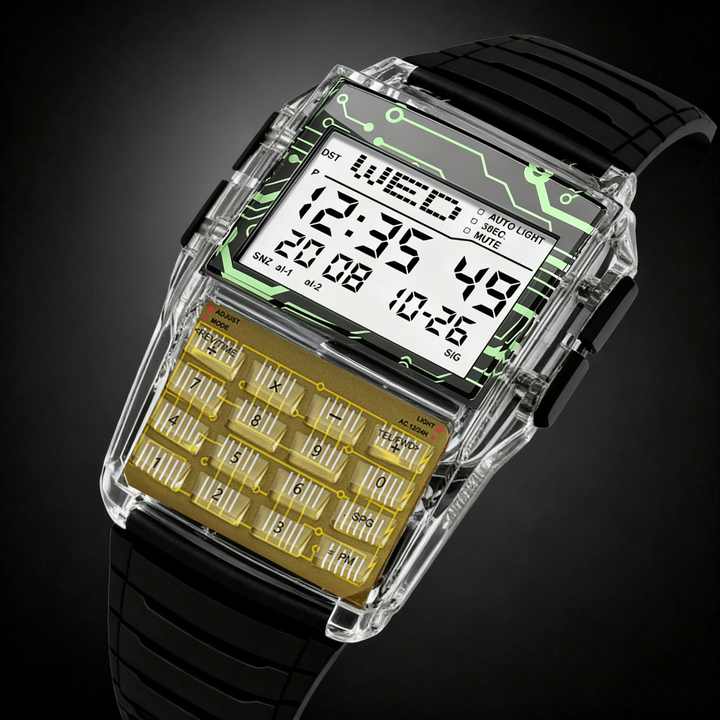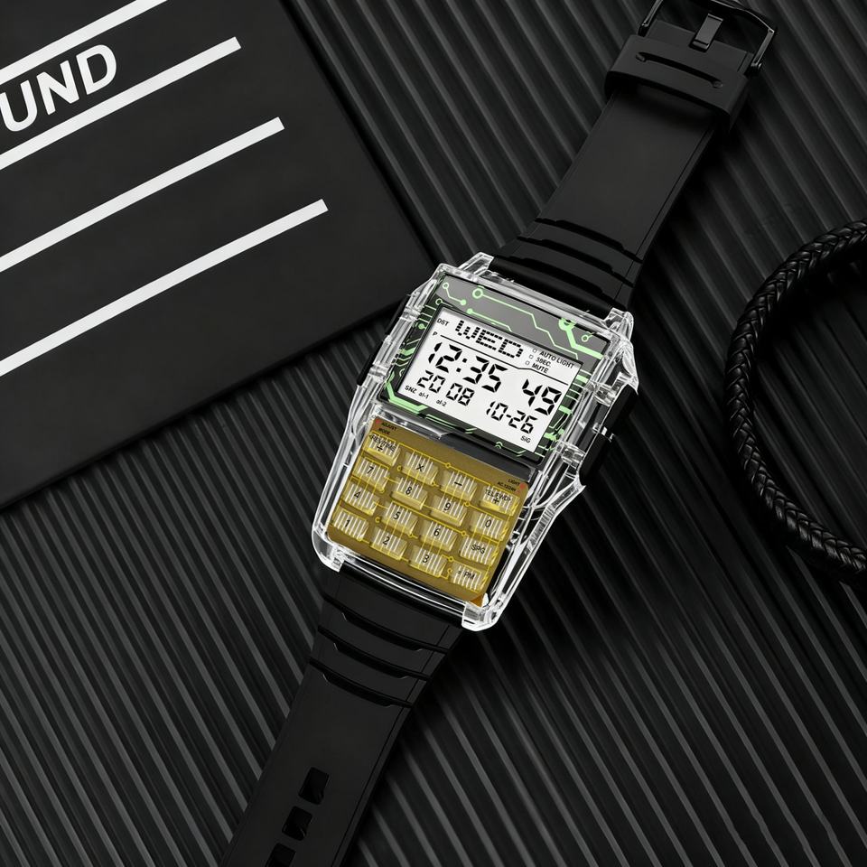 Montre multifonction pour homme avec calculatrice, boîtier transparent en plastique, bracelet en TPU, affichage à LED, montre numérique