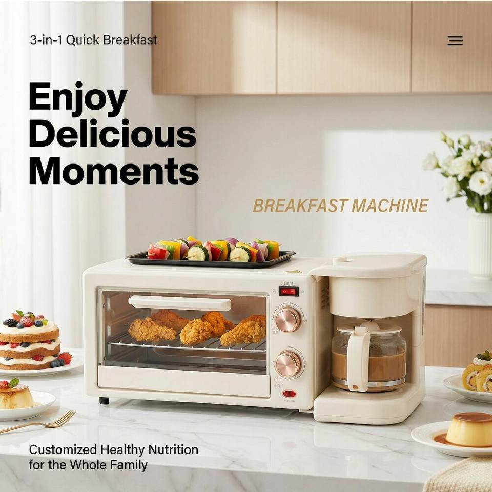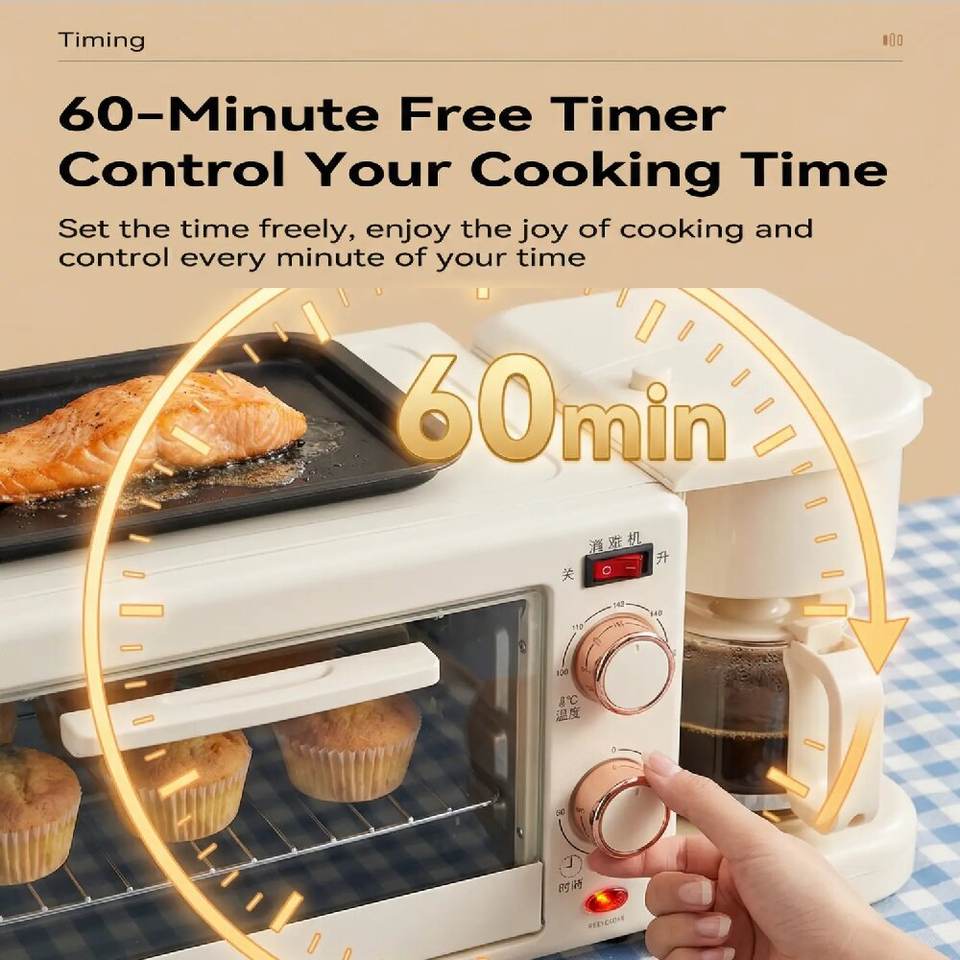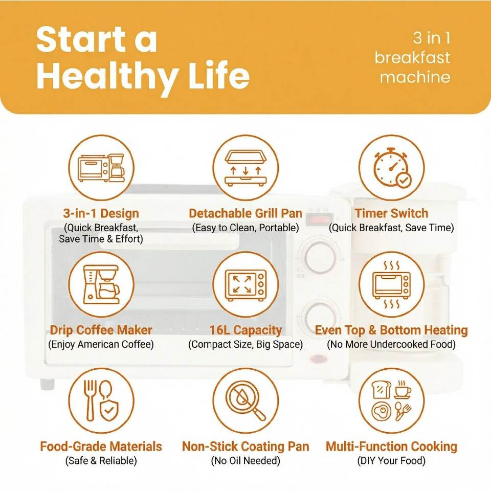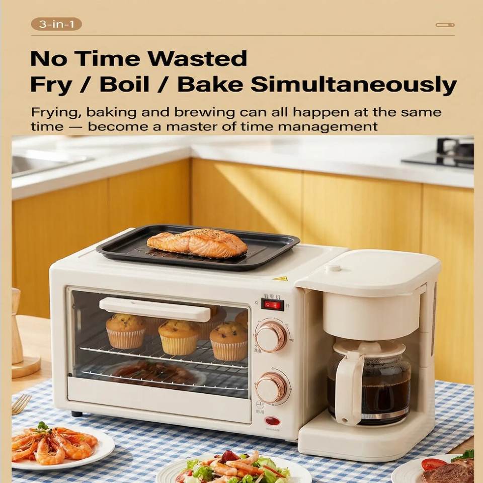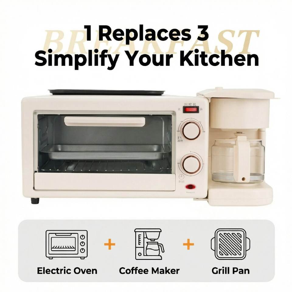 Station de petit-déjeuner multifonctionnelle 3-en-1 : grille-pain, cafetière, poêle à frire, acier inoxydable, économie d'énergie, appareil électroménager