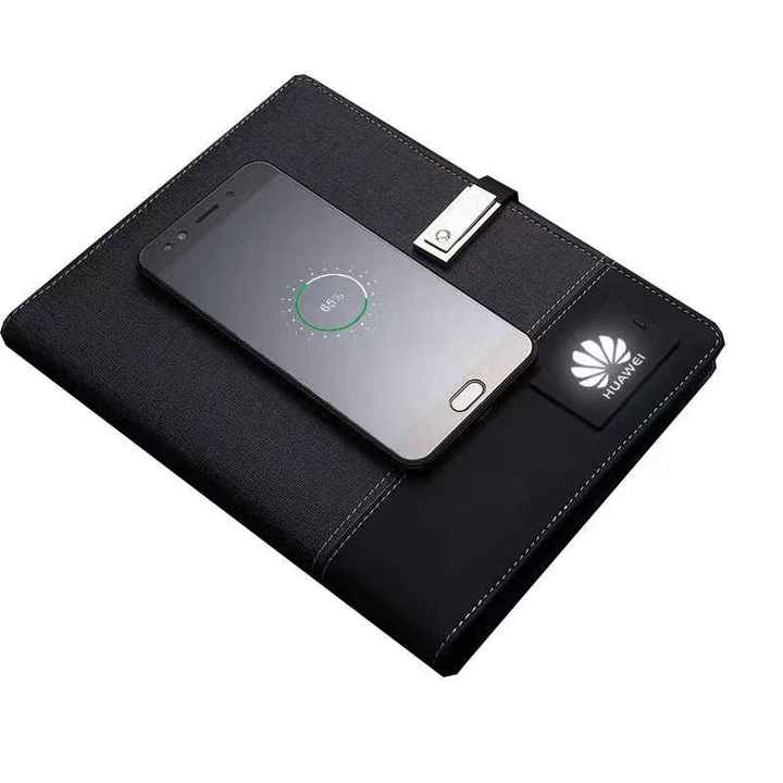 Carnet Multifonctionnel A5 en Cuir PU avec Recharge sans Fil, Agenda Rechargeable, et Banque d'Énergie, Logo Lumineux Personnalisable