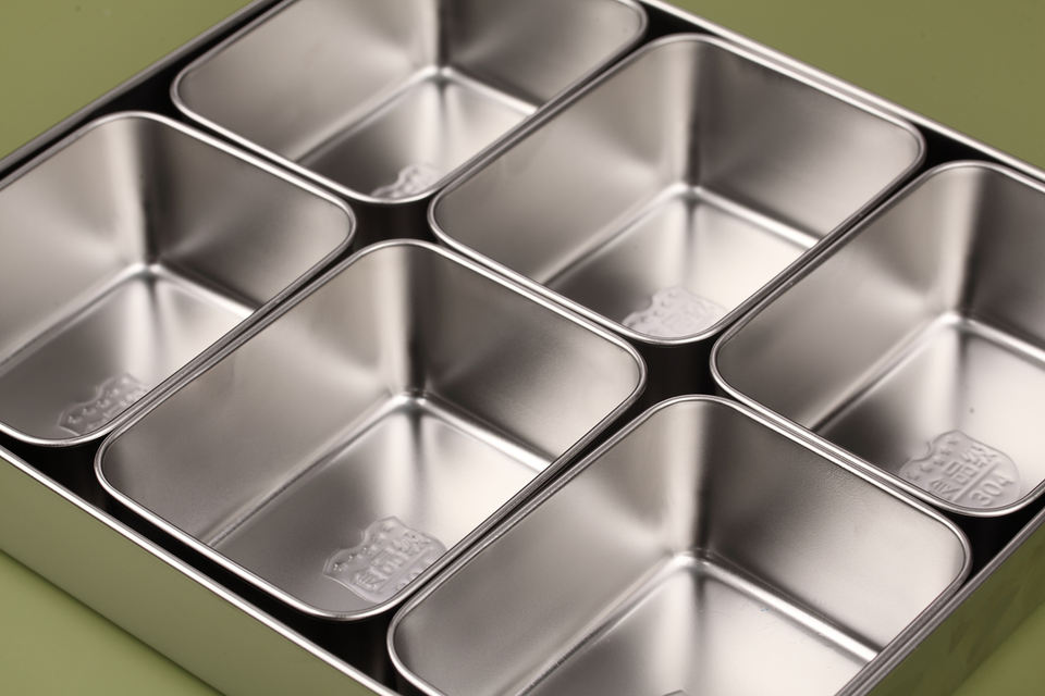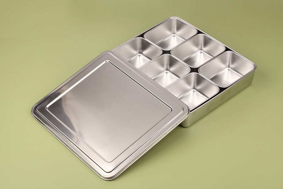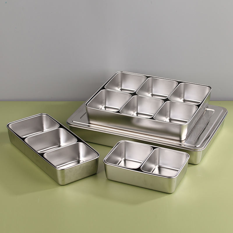 Plateau multifonctionnel en acier inoxydable de qualité alimentaire à six compartiments, boîte de rangement métallique compartimentée, séparateur de repas en acier inoxydable